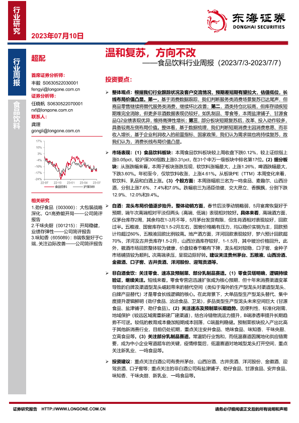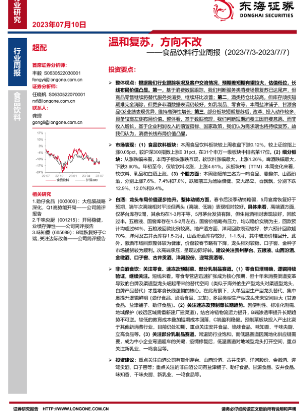 【东海证券】【20230710】20230710-东海证券-食品饮料行业周报:温和复苏,方向不改-12页