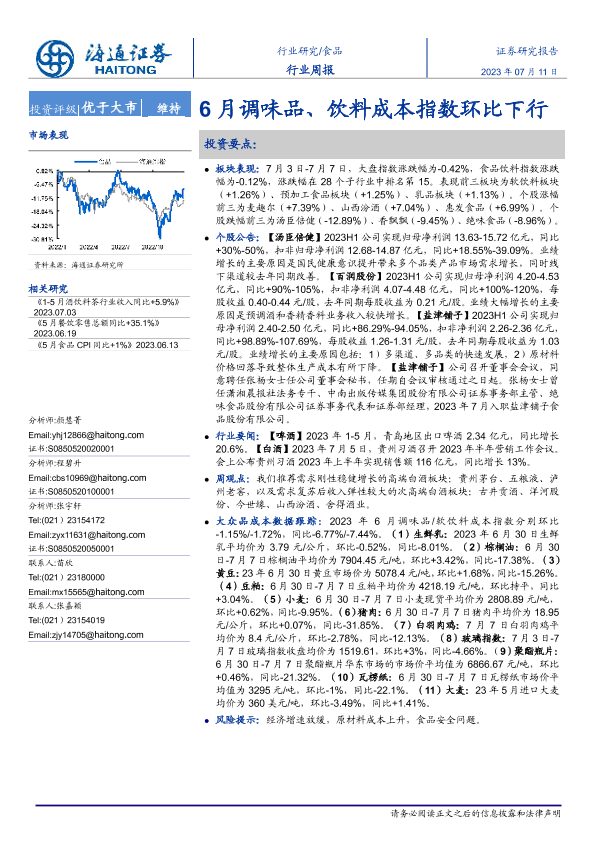 【海通证券】【20230711】20230711-海通证券-食品行业周报:6月调味品、饮料成本指数环比下行-16页