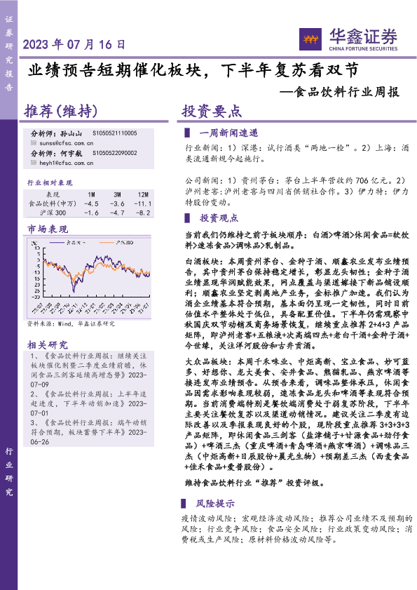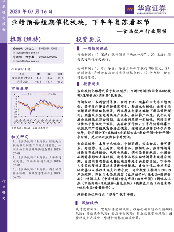 【华鑫证券】【20230716】20230716-华鑫证券-食品饮料行业周报:业绩预告短期催化板块,下半年复苏看双节-26页