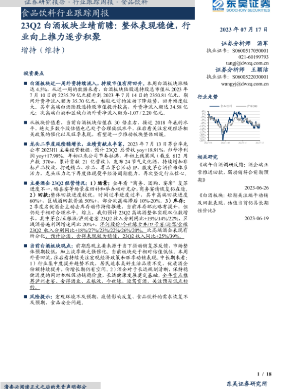 【东吴证券】【20230717】20230717-东吴证券-食品饮料行业跟踪周报:23Q2白酒板块业绩前瞻:整体表现稳健,行业向上推力逐步积聚-18页