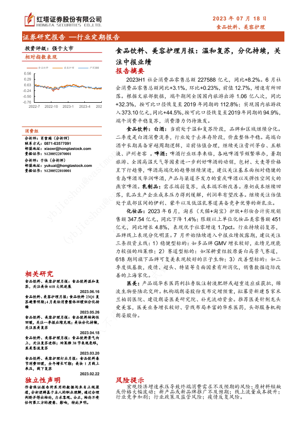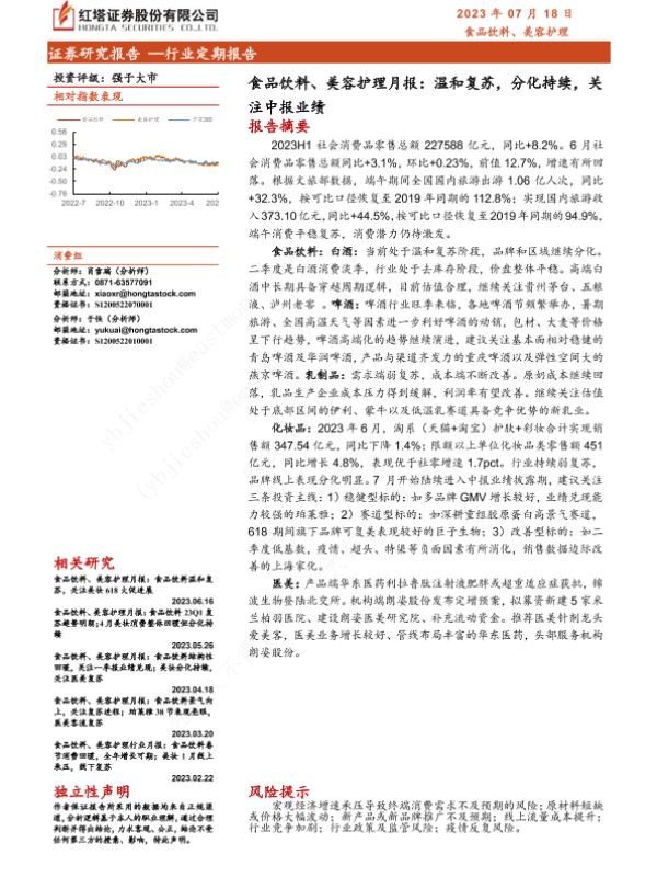 【红塔证券】【20230718】食品饮料、美容护理月报:温和复苏,分化持续,关注中报业绩-17页