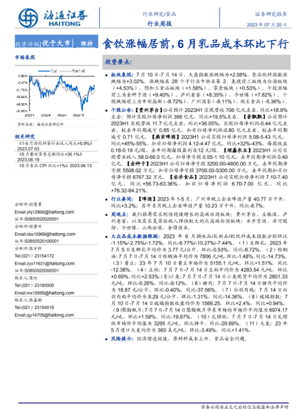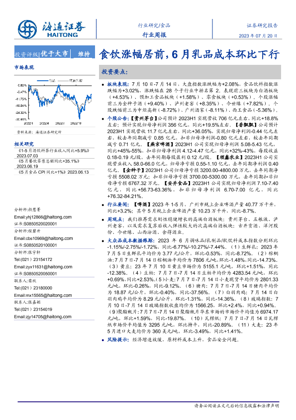 【海通证券】【20230720】20230720-海通证券-食品行业周报:食饮涨幅居前,6月乳品成本环比下行-18页