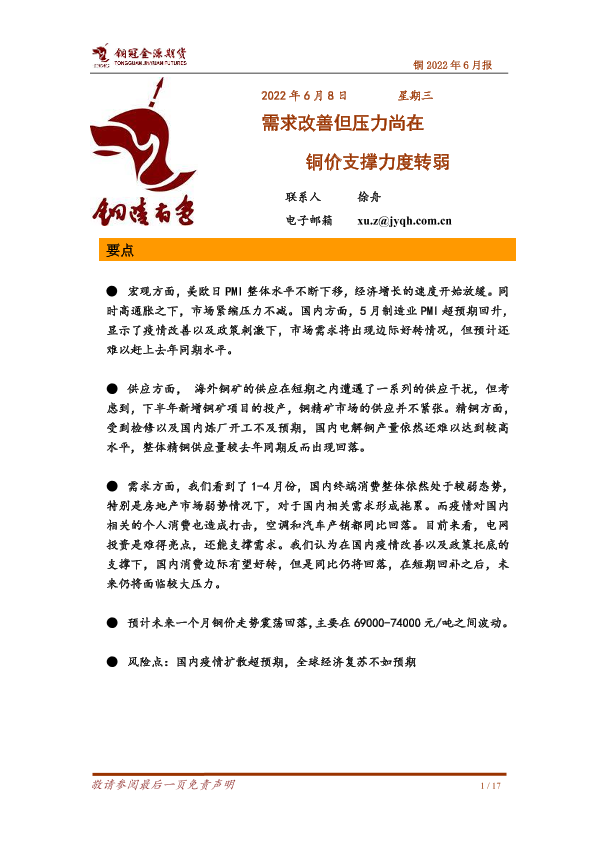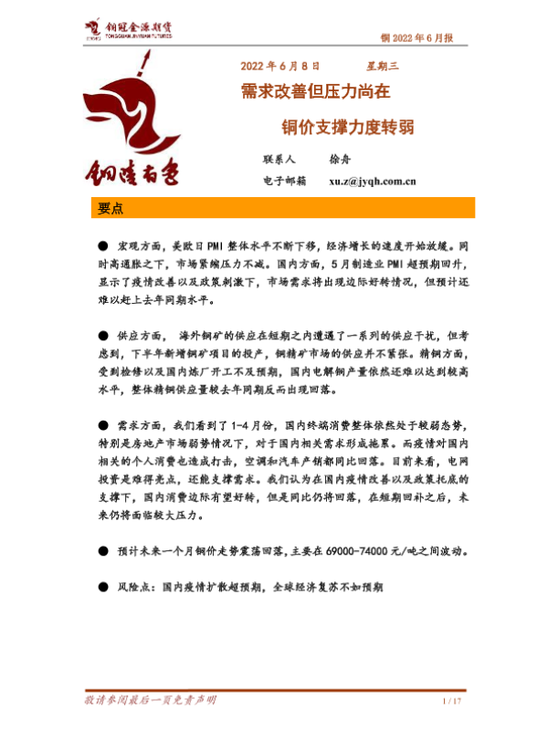 【铜冠金源期货】【20220608】铜2022年6月报:需求改善但压力尚在,铜价支撑力度转弱-17页