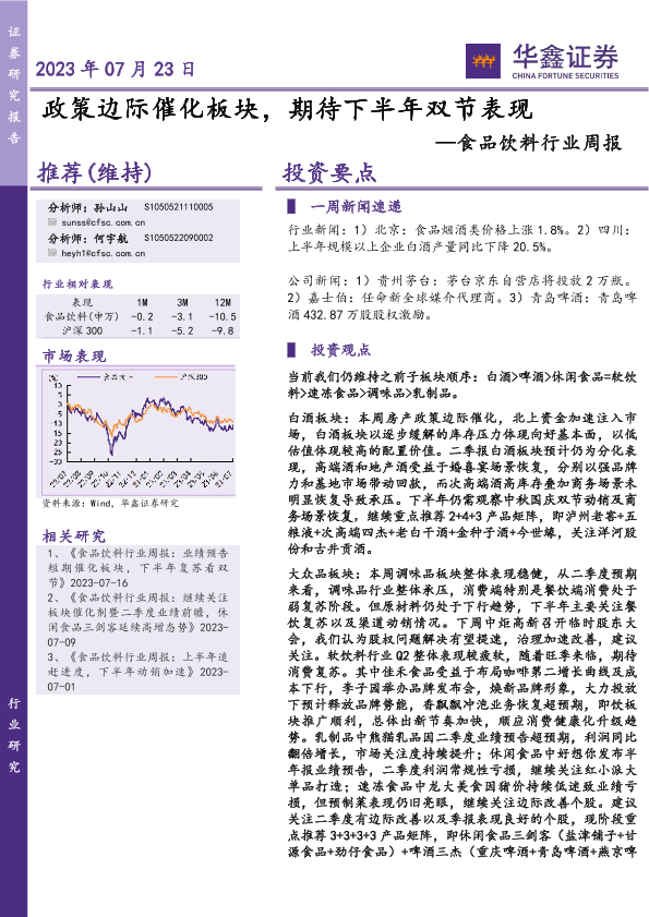 【华鑫证券】【20230723】20230723-华鑫证券-食品饮料行业周报:政策边际催化板块,期待下半年双节表现-25页