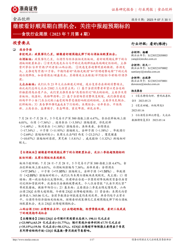 【浙商证券】【20230730】食饮行业周报(2023年7月第4期):继续看好顺周期白酒机会,关注中报超预期标的-17页