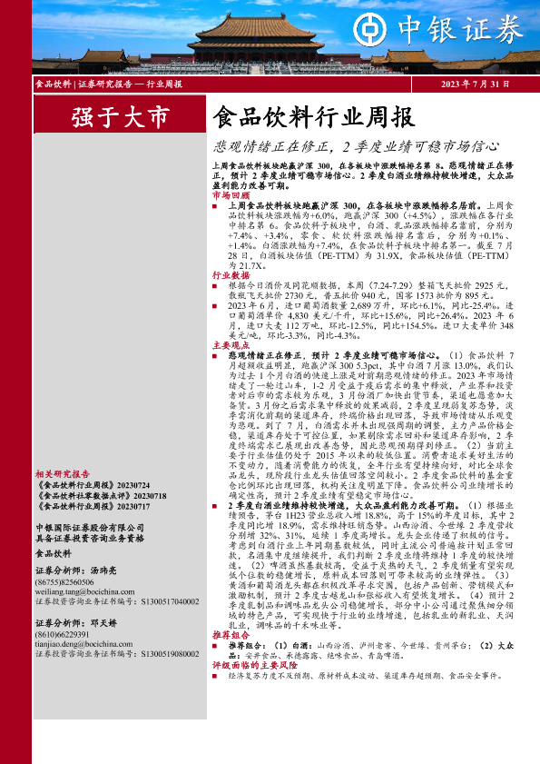 【中银证券】【20230731】20230731-中银证券-食品饮料行业周报:悲观情绪正在修正,2季度业绩可稳市场信心-19页