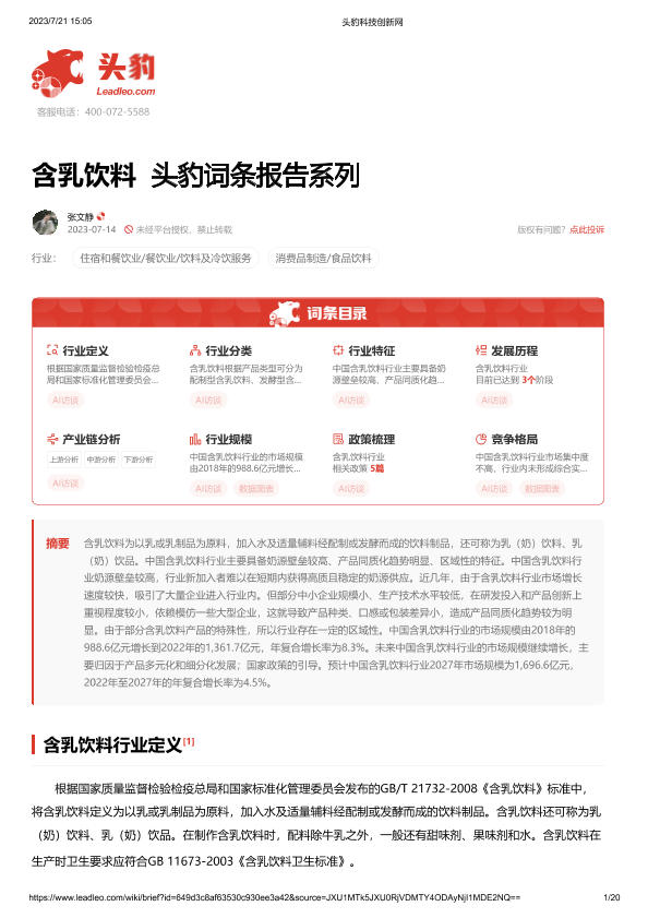 【头豹研究院】【20230721】含乳饮料 头豹词条报告系列-20页