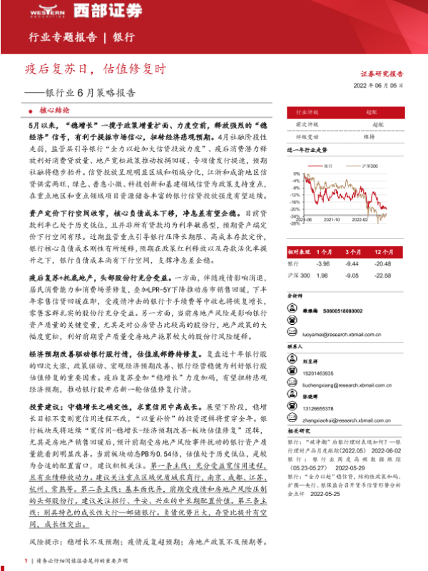 【西部证券】【20220605】银行业6月策略报告:疫后复苏日,估值修复时-15页