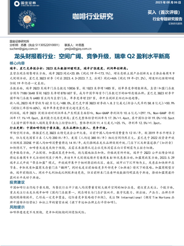 【国金证券】【20230806】龙头财报看行业:空间广阔、竞争升级,瑞幸Q2盈利水平新高-15页