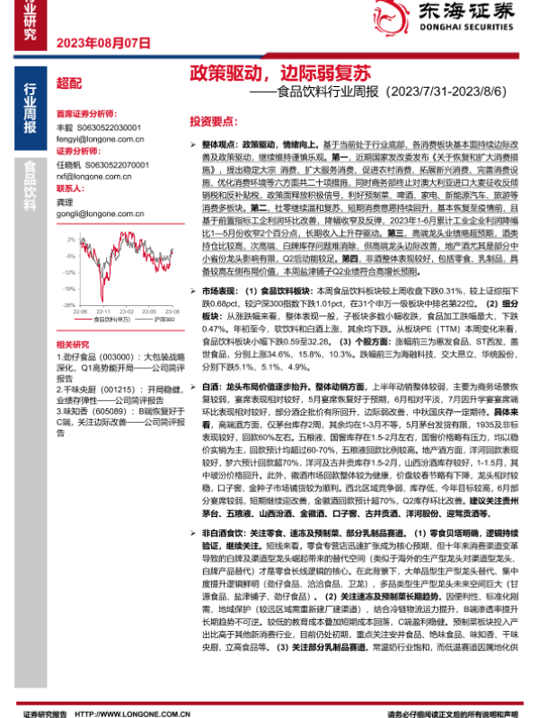 【东海证券】【20230807】20230807-东海证券-食品饮料行业周报:政策驱动,边际弱复苏-13页