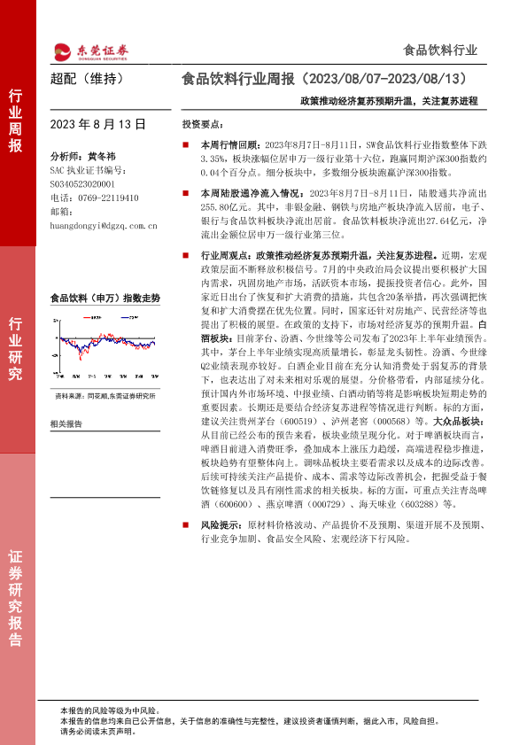 【东莞证券】【20230813】20230813-东莞证券-食品饮料行业周报:政策推动经济复苏预期升温,关注复苏进程-13页