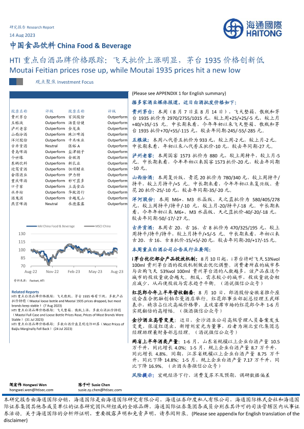 【海通国际】【20230814】HTI重点白酒品牌价格跟踪:飞天批价上涨明显,茅台1935价格创新低-13页
