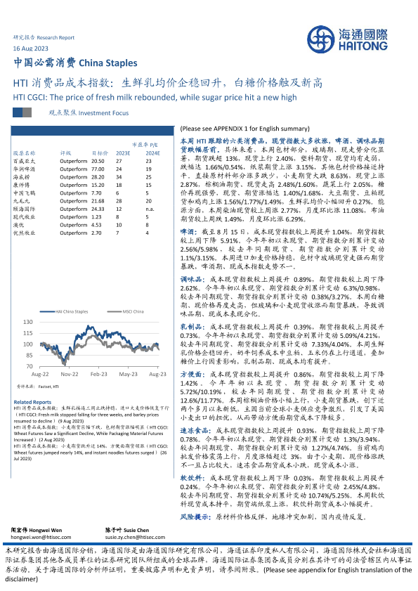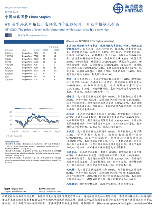【海通国际】【20230816】HTI消费品成本指数:生鲜乳均价企稳回升,白糖价格触及新高-17页