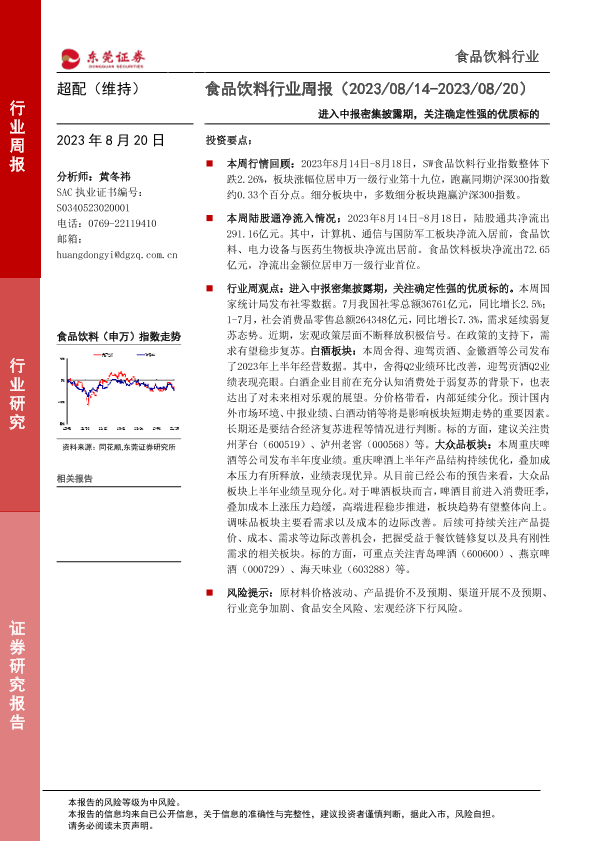 【东莞证券】【20230820】食品饮料行业周报:进入中报密集披露期,关注确定性强的优质标的-14页