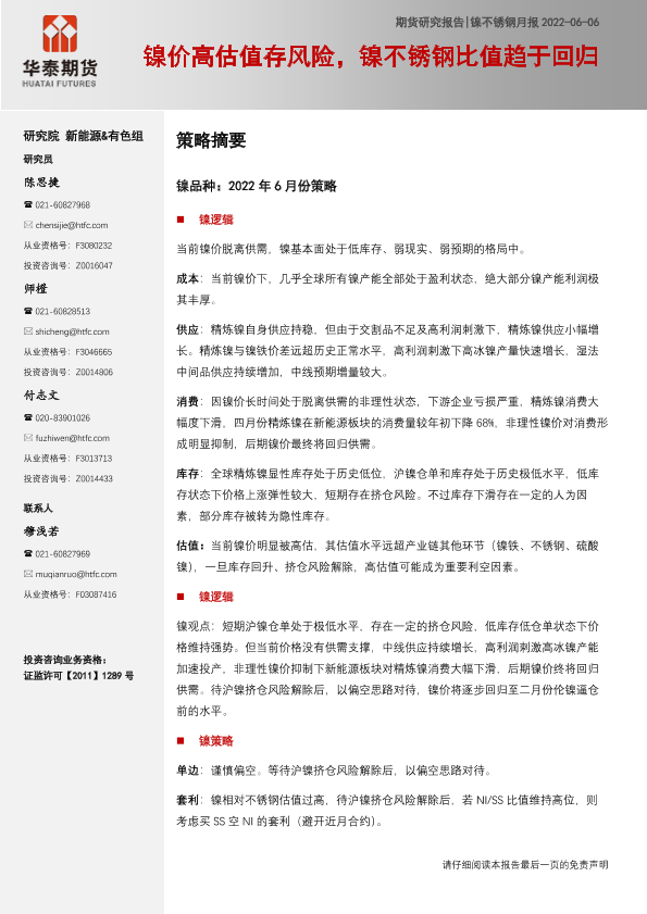 【华泰期货】【20220606】镍不锈钢月报:镍价高估值存风险,镍不锈钢比值趋于回归-32页
