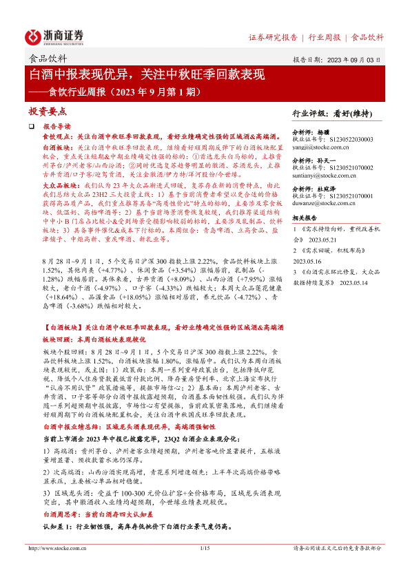【浙商证券】【20230903】食饮行业周报(2023年9月第1期):白酒中报表现优异,关注中秋旺季回款表现-15页