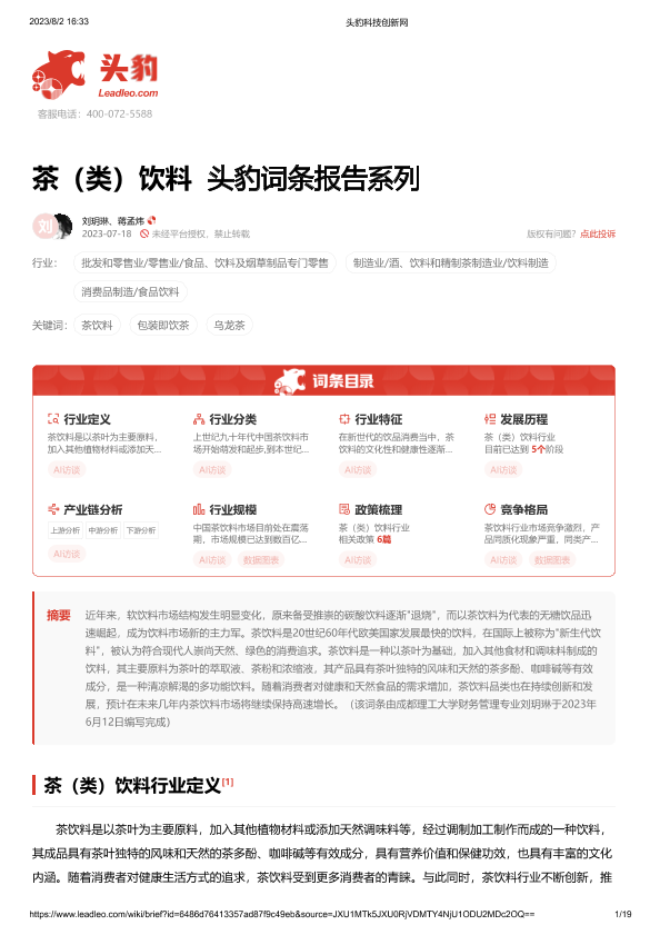 【头豹研究院】【20230718】茶(类)饮料 头豹词条报告系列-19页