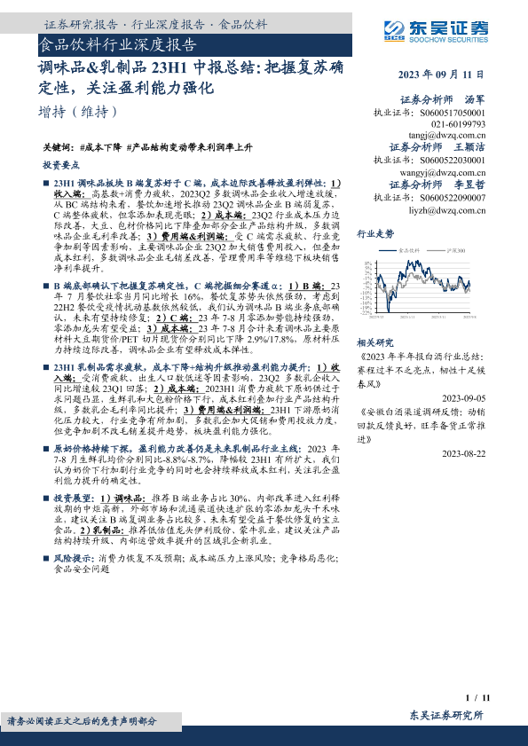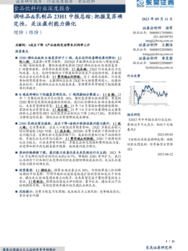 【东吴证券】【20230911】调味品&乳制品23H1中报总结:把握复苏确定性,关注盈利能力强化-11页