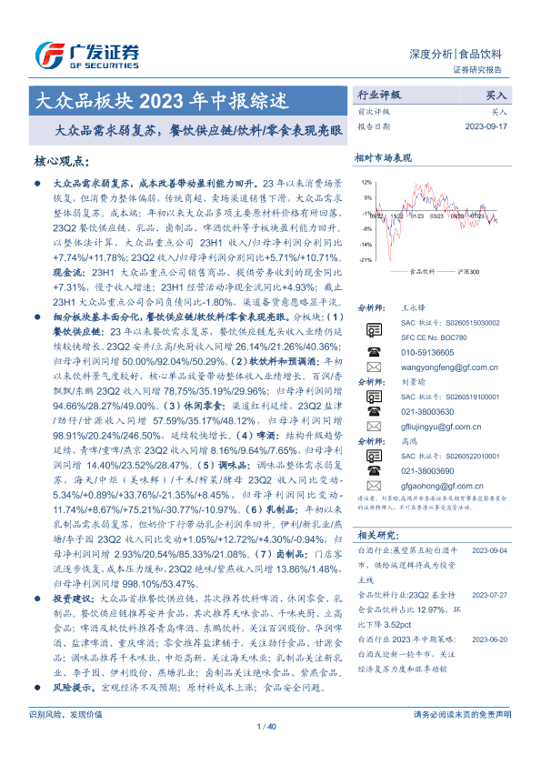 【广发证券】【20230917】20230917-广发证券-食品饮料:大众品板块2023年中报综述-大众品需求弱复苏,餐饮供应链 饮料 零食表现亮眼-40页