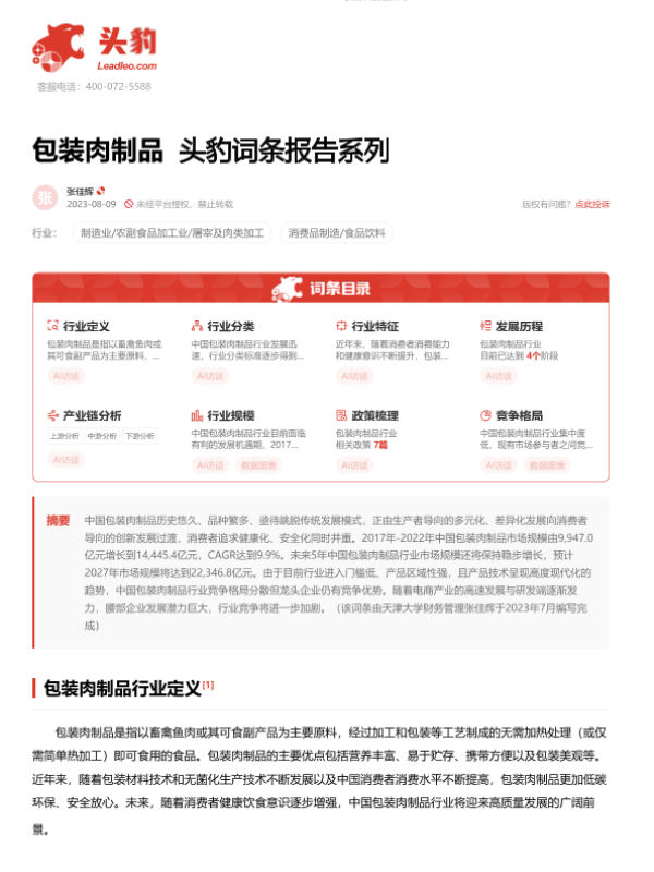 【头豹研究院】【20230809】包装肉制品 头豹词条报告系列-23页