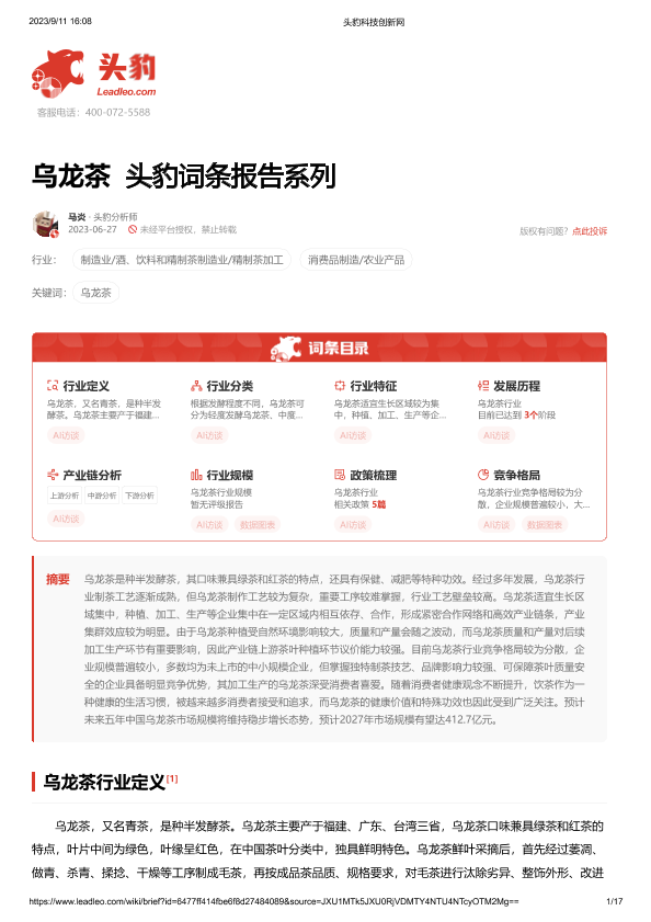 【头豹研究院】【20230911】乌龙茶 头豹词条报告系列-17页