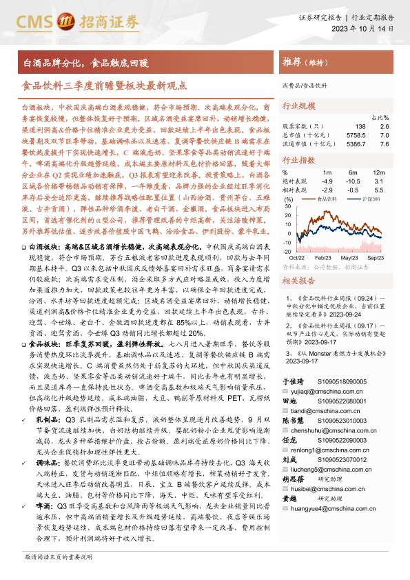 【海通证券】【20231014】食品饮料三季度前瞻暨板块最新观点:白酒品牌分化,食品触底回暖-13页