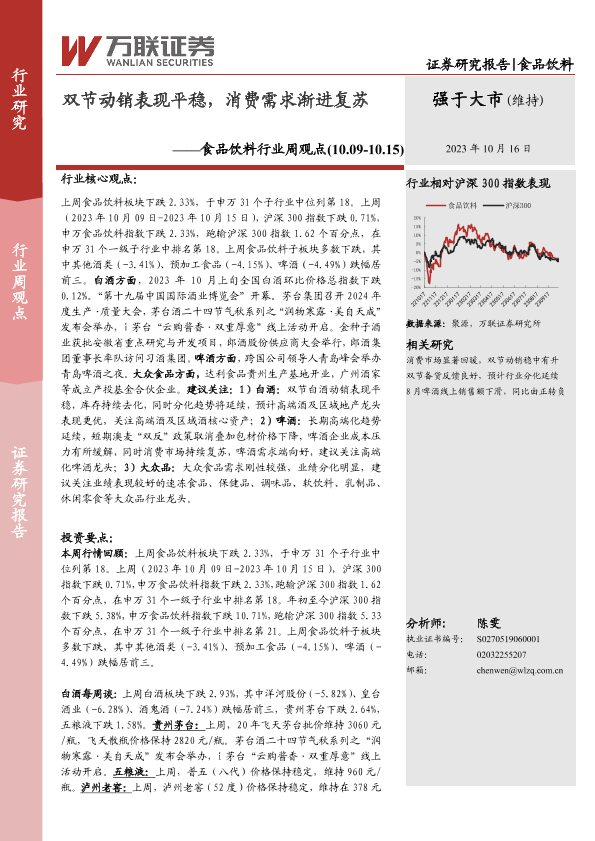 【万联证券】【20231016】20231016-万联证券-食品饮料行业周观点:双节动销表现平稳,消费需求渐进复苏-12页