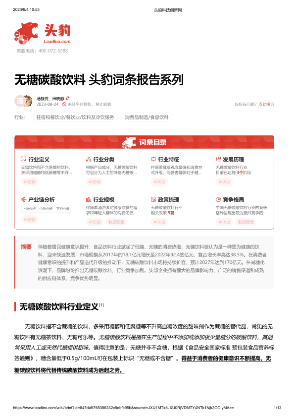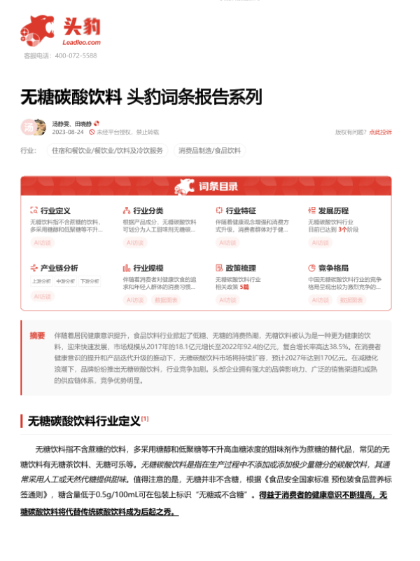 【头豹研究院】【20230824】无糖碳酸饮料 头豹词条报告系列-13页