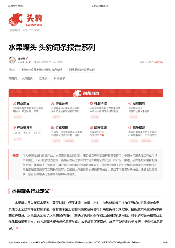 【头豹研究院】【20230831】水果罐头 头豹词条报告系列-19页