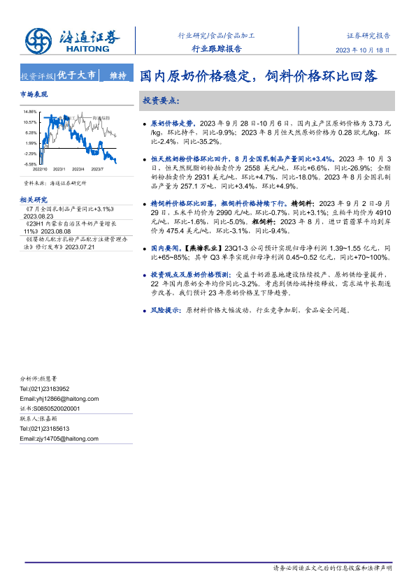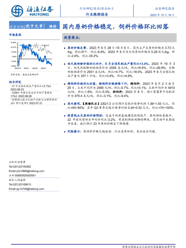 【海通证券】【20231018】20231018-海通证券-食品加工行业跟踪报告:国内原奶价格稳定,饲料价格环比回落-10页