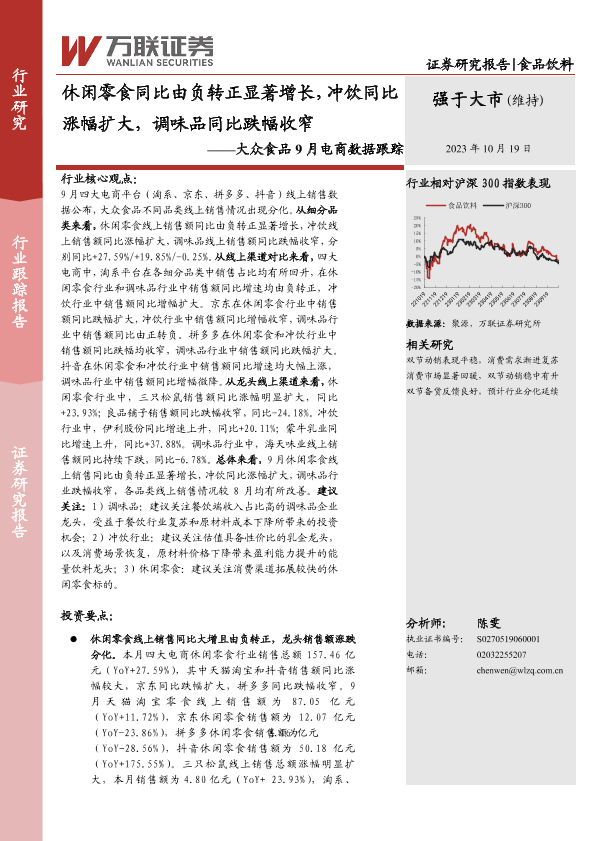 【万联证券】【20231019】大众食品9月电商数据跟踪:休闲零食同比由负转正显著增长,冲饮同比涨幅扩大,调味品同比跌幅收窄-13页