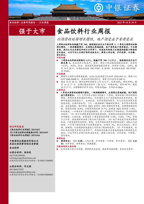【中银证券】【20231030】20231030-中银证券-食品饮料行业周报:白酒营收延续增长惯性,地产酒受益于宴席需求-16页