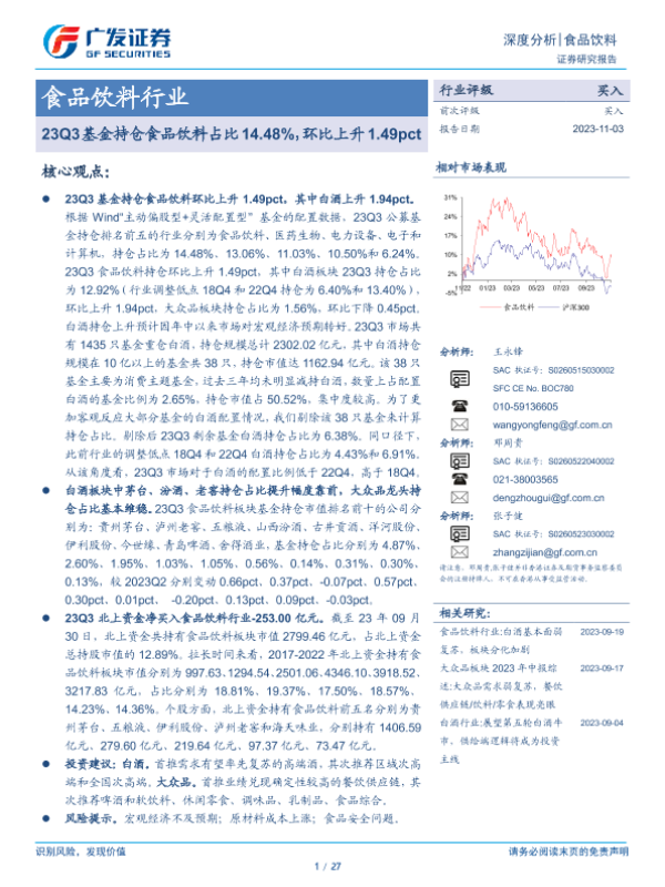 【广发证券】【20231103】23Q3基金持仓食品饮料占比14.48%,环比上升1.49pct-27页