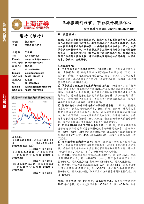 【上海证券】【20231105】20231105-上海证券-食品饮料行业周报:三季报顺利收官,茅台提价提振信心-27页