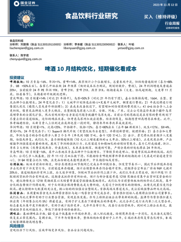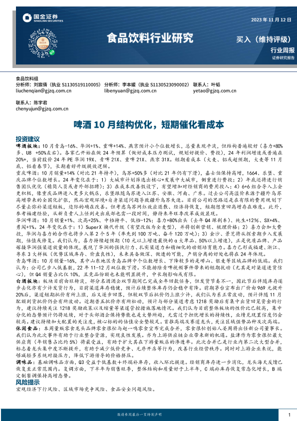 【国金证券】【20231112】食品饮料行业研究:啤酒10月结构优化,短期催化看成本-11页