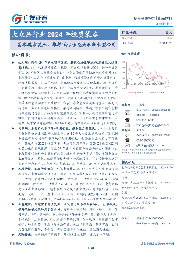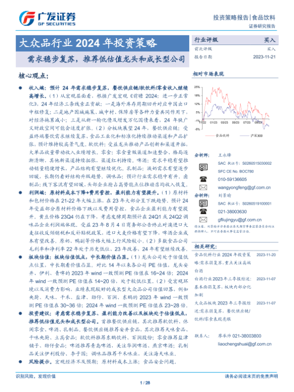 【广发证券】【20231121】大众品行业2024年投资策略:需求稳步复苏,推荐低估值龙头和成长型公司-28页