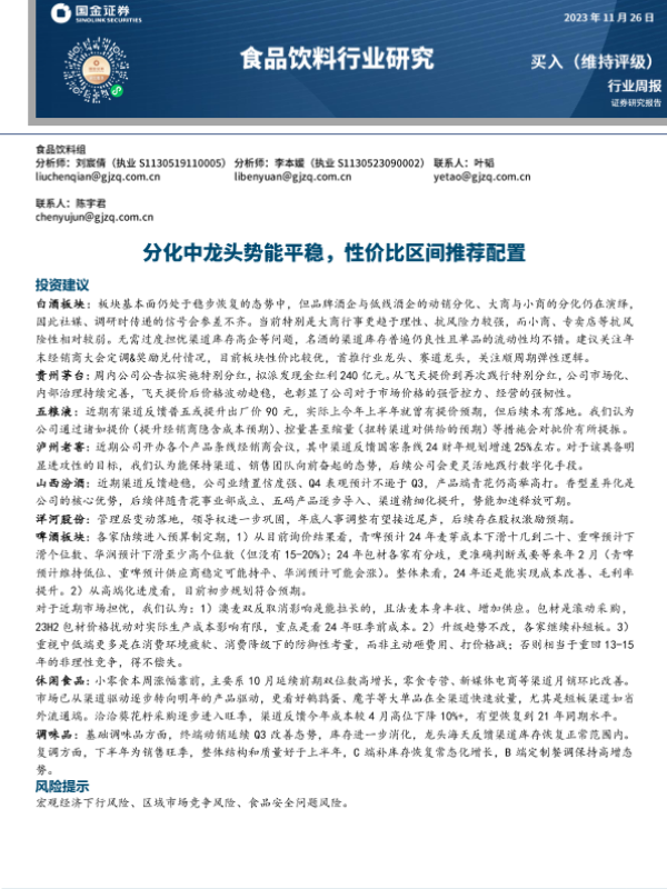 【国金证券】【20231126】20231126-国金证券-食品饮料行业研究:分化中龙头势能平稳,性价比区间推荐配置-12页