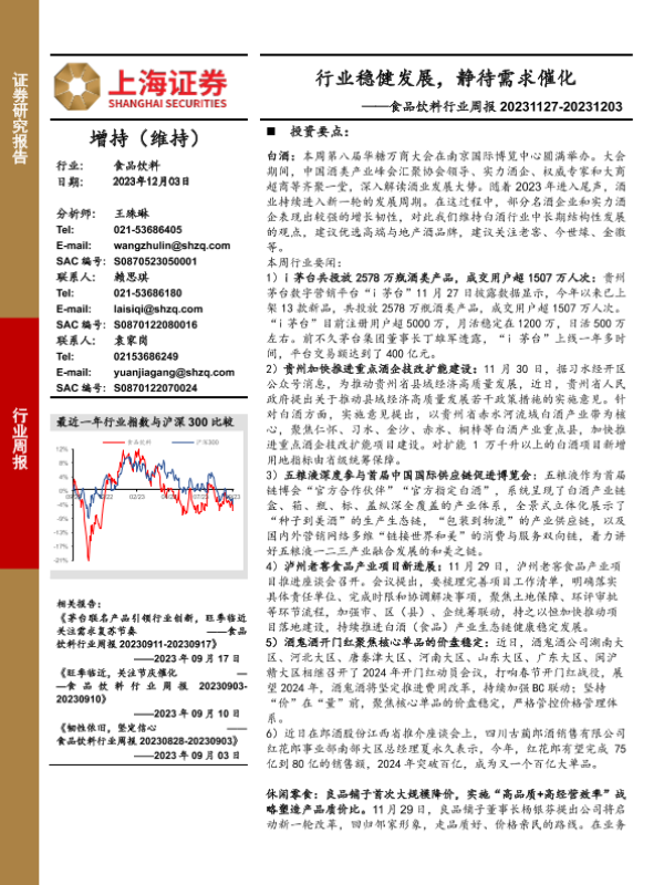 【上海证券】【20231203】食品饮料行业周报:行业稳健发展,静待需求催化-22页
