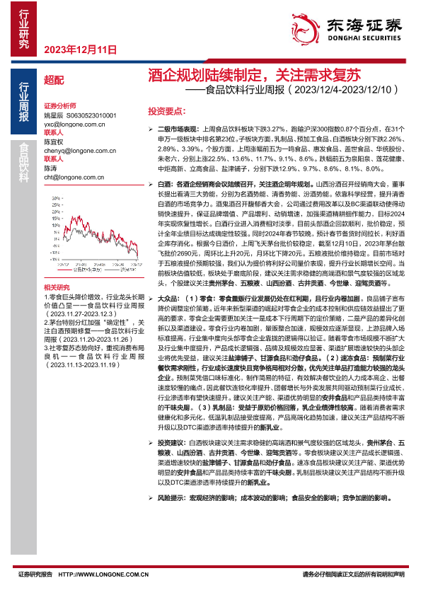 【东海证券】【20231211】20231211-东海证券-食品饮料行业周报:酒企规划陆续制定,关注需求复苏-10页