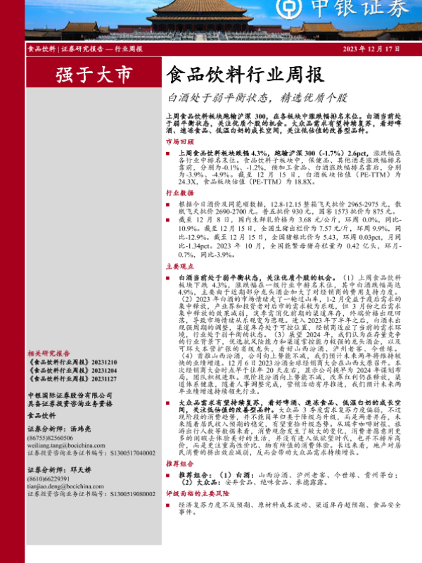 【中银证券】【20231217】20231217-中银证券-食品饮料行业周报:白酒处于弱平衡状态,精选优质个股-16页