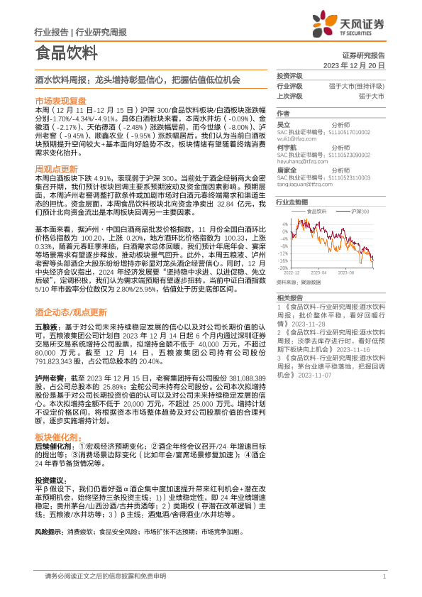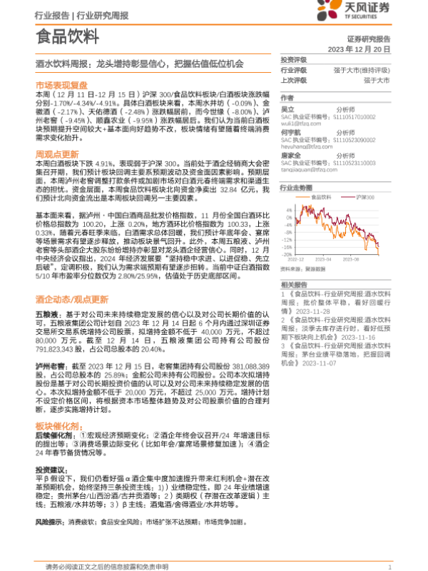 【天风证券】【20231220】20231220-天风证券-酒水饮料周报:龙头增持彰显信心,把握估值低位机会-16页