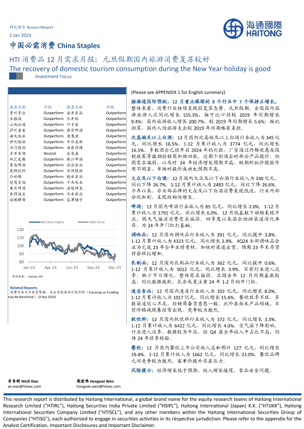 【海通国际】【20240102】HTI消费品行业12月需求月报:元旦假期国内旅游消费复苏较好-14页