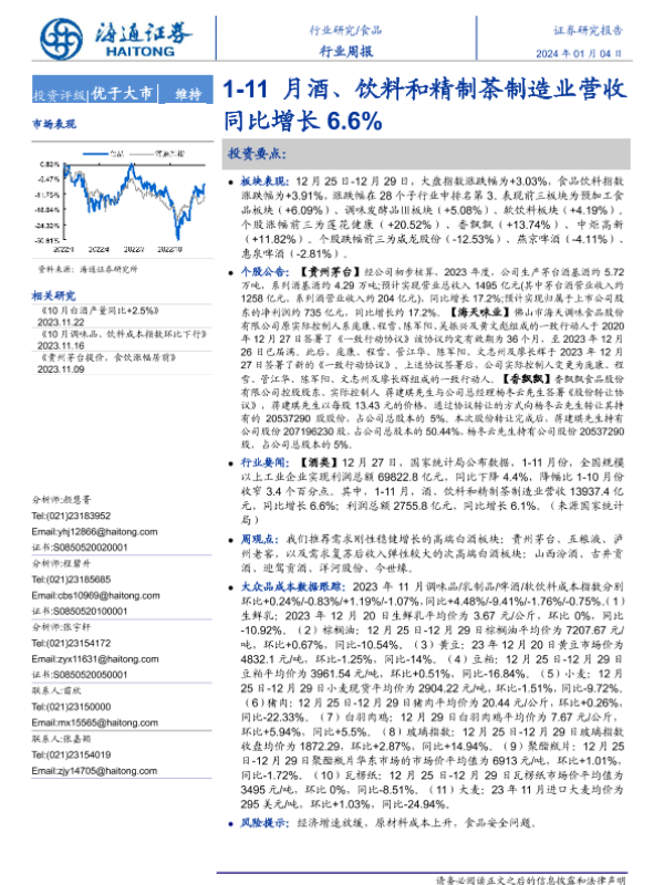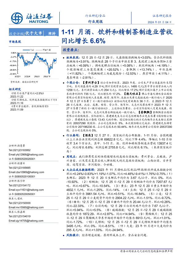 【海通证券】【20240104】20240104-海通证券-食品行业周报:1-11月酒、饮料和精制茶制造业营收同比增长6.6%-18页