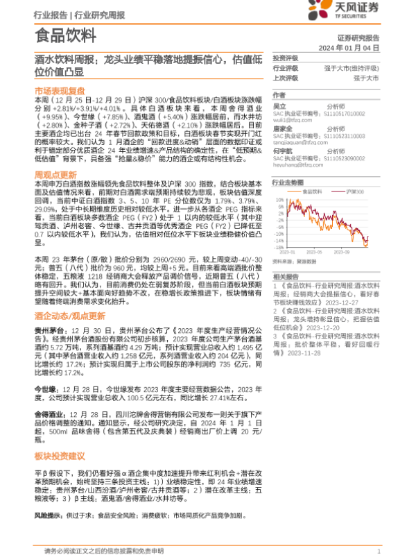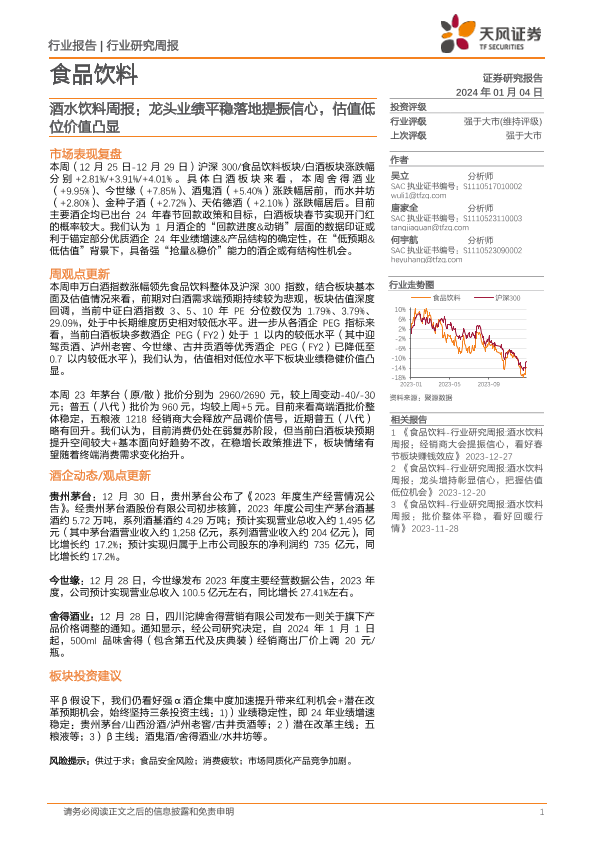 【天风证券】【20240104】20240104-天风证券-酒水饮料周报:龙头业绩平稳落地提振信心,估值低位价值凸显-16页