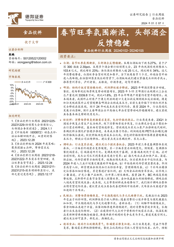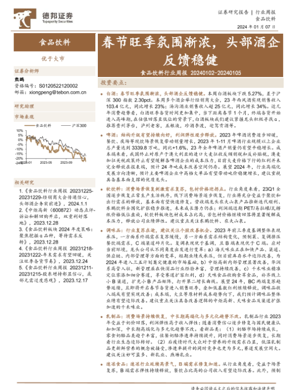 【德邦证券】【20240107】20240107-德邦证券-食品饮料行业周报:春节旺季氛围渐浓,头部酒企反馈稳健-16页