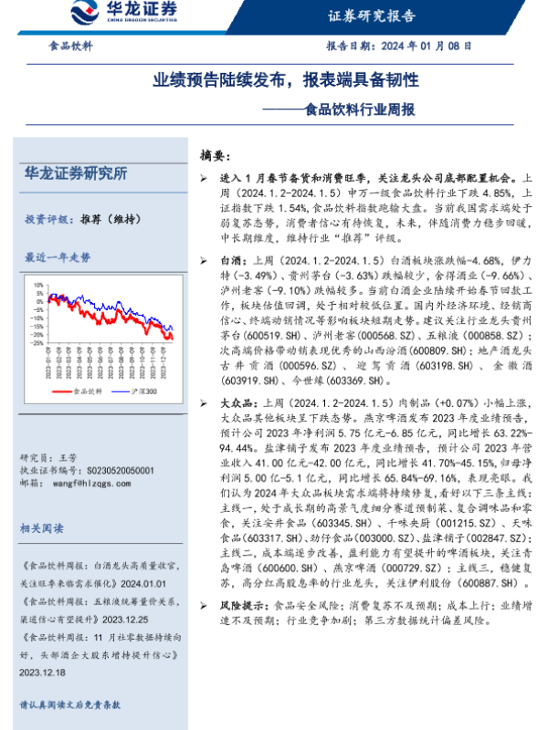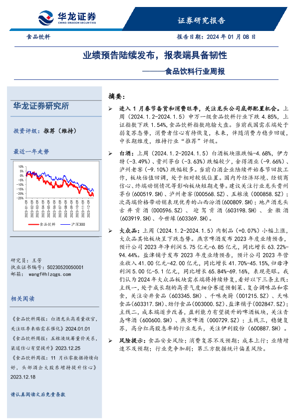 【华龙证券】【20240108】20240108-华龙证券-食品饮料行业周报:业绩预告陆续发布,报表端具备韧性-11页