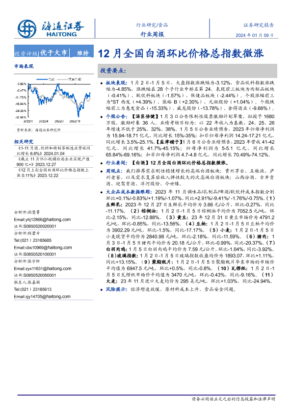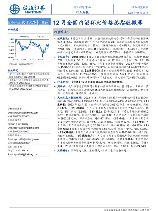 【海通证券】【20240109】20240109-海通证券-食品行业周报:12月全国白酒环比价格总指数微涨-17页