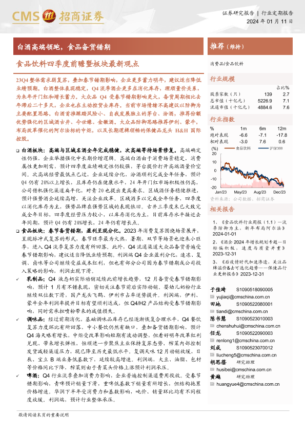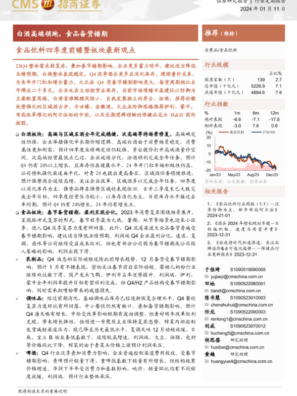 【海通证券】【20240111】食品饮料行业四季度前瞻暨板块最新观点:白酒高端领跑,食品备货错期-16页