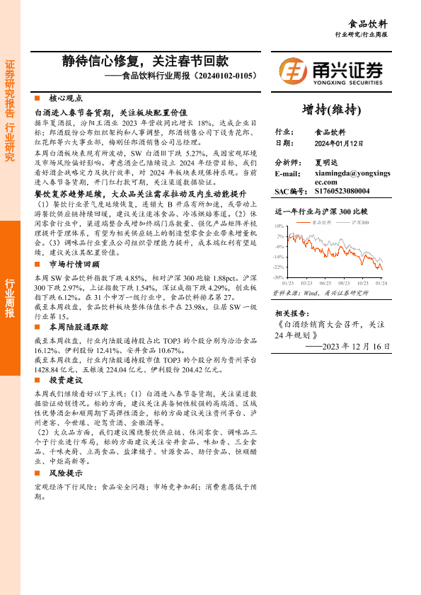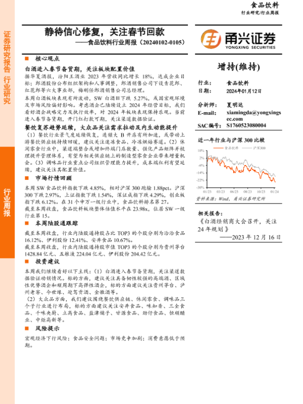 【甬兴证券】【20240112】20240112-甬兴证券-食品饮料行业周报:静待信心修复,关注春节回款-15页