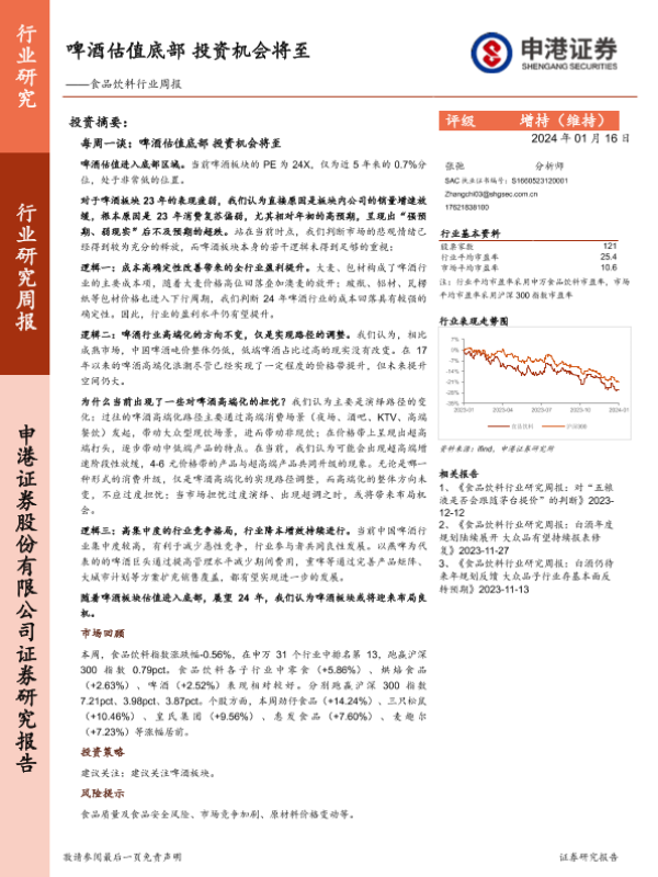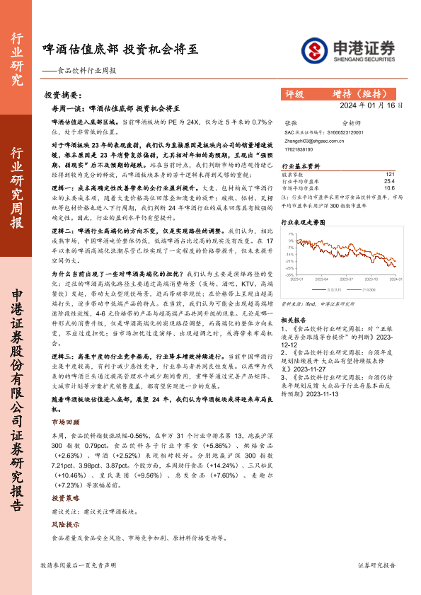 【申港证券】【20240116】20240116-申港证券-食品饮料行业周报:啤酒估值底部 投资机会将至-20页